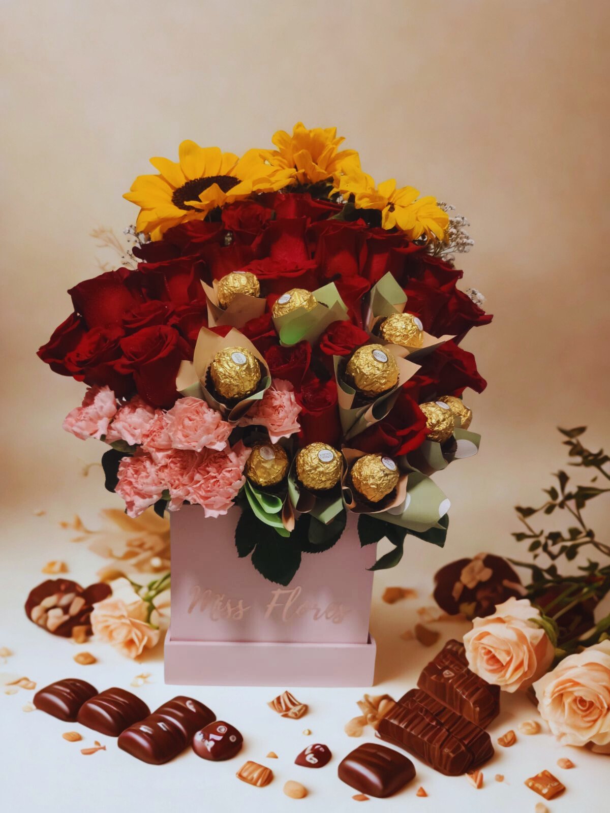 Imponente arreglo floral premium que combina la alegría y energía de 3 girasoles, la elegancia de 24 rosas frescas y el irresistible toque dulce de 10 chocolates Ferrero Rocher, creando un regalo sofisticado y lleno de emoción.