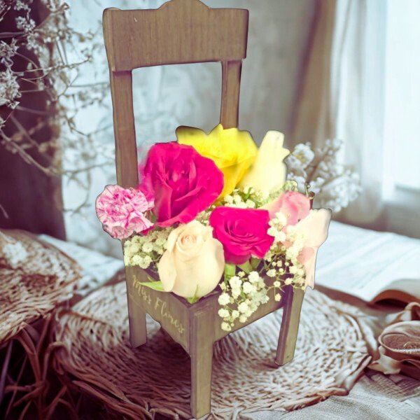 Beautiful and delicate floral arrangement presented in a small decorative white trupan (MDF) chair, designed with a charming mix of fresh flowers and delicate roses. A sweet and thoughtful gift, perfect for expressing love, tenderness, and affection.